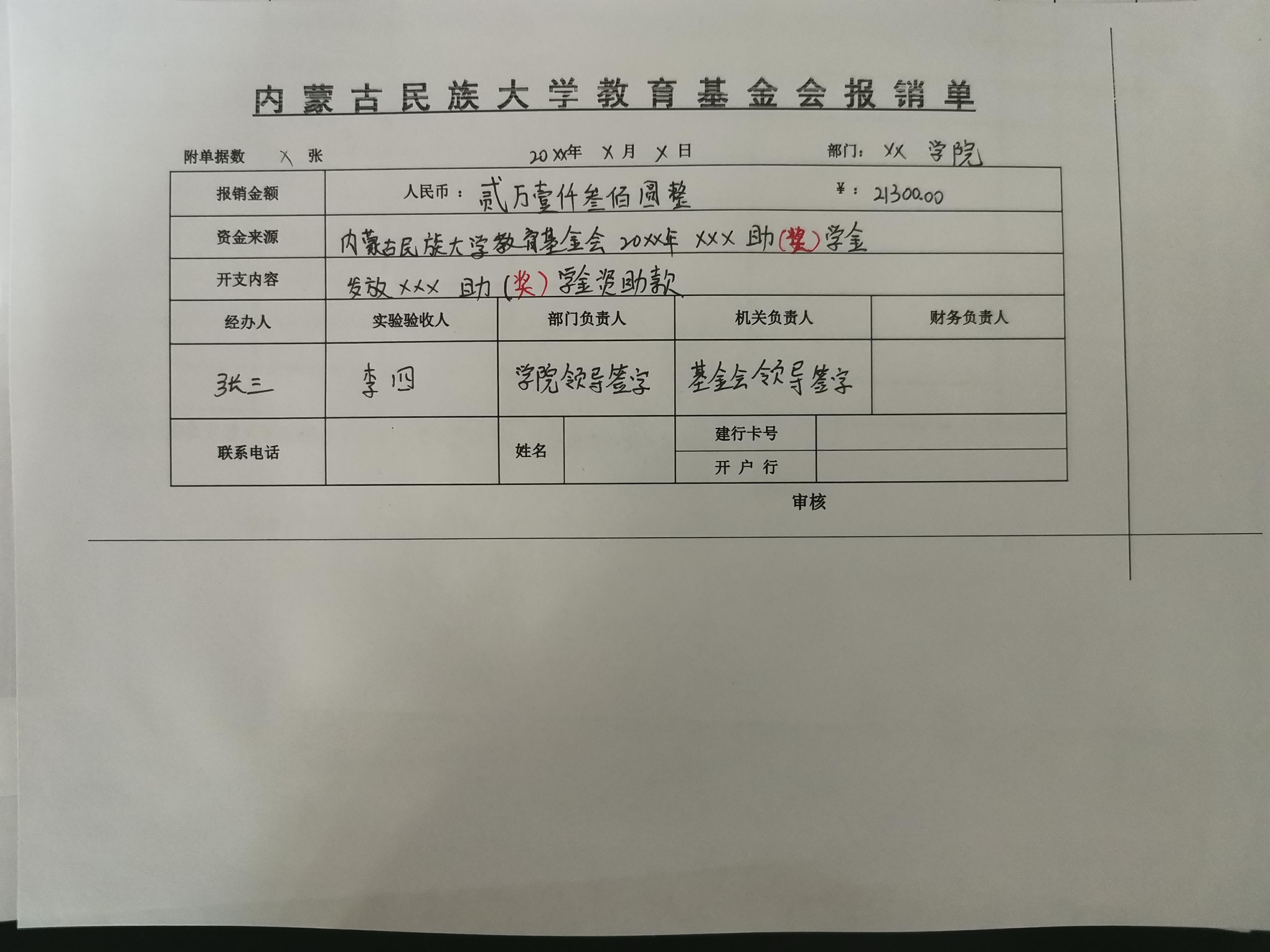 内蒙古民族大学教育基金会报销单空表、填写样本和票据粘贴单