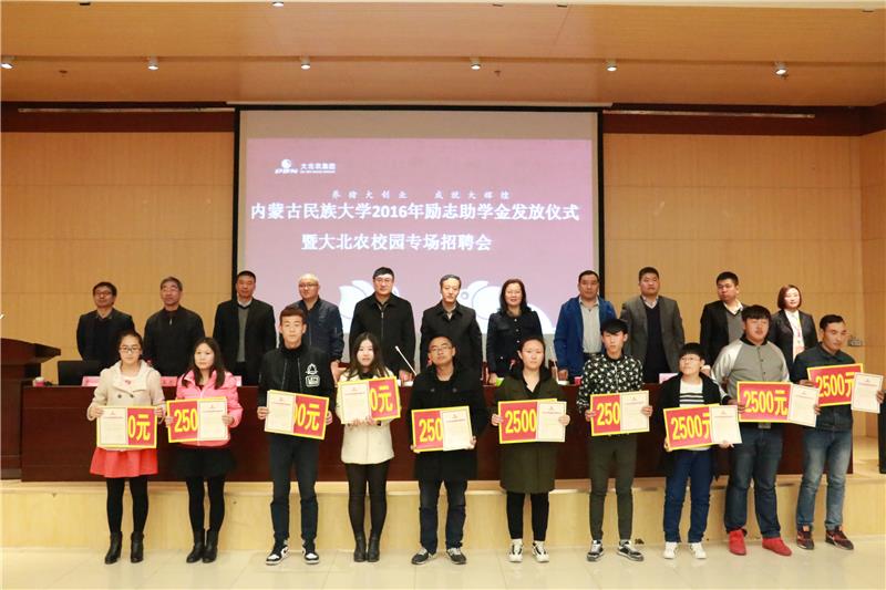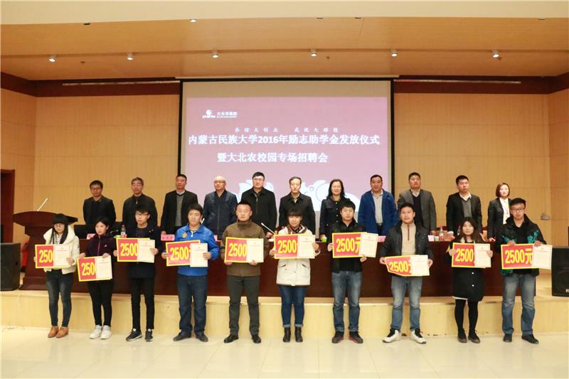 12月13日,农学院在图书馆小报告厅举行了“大北农励志助学金”发放仪式。内蒙古民族大学校长助理、教育基金会理事长朝伦巴特尔,大北农集团蒙东大区总经理秦琪中、大北农集团通辽事业部总经理张爽等嘉宾,农学院党总支书记都春霞、副书记张淑艳等出席,并向受资助的2013级园林班吴慧超等15名同学发放了助学金。农学院学工办团总支辅导员、获得资助的同学、毕业生及学生代表参加仪式。