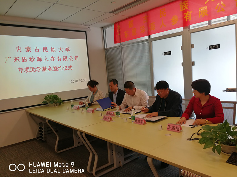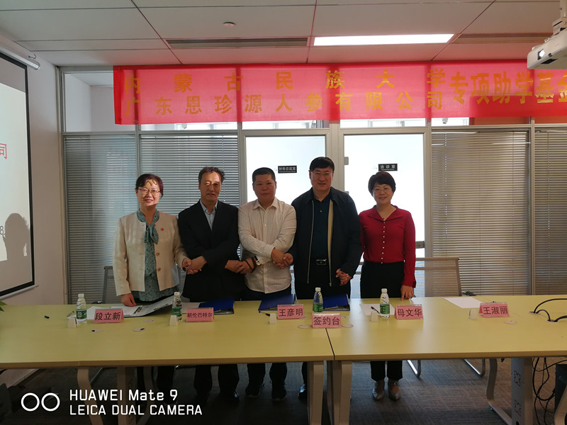 10月30日,广东恩珍源人参有限公司“畜牧人”专项助学基金签约仪式在广州市举行。广东恩珍源人参有限公司董事长王彦明与内蒙古民族大学教育基金会理事长朝伦巴特尔、动物科技学院党总支书记段立新、生命科学学院党总支书记母文华共同签署了广东恩珍源人参有限公司在内蒙古民族大学设立“畜牧人”专项助学基金的协议。广东恩珍源人参有限公司财务总监王淑丽参加仪式。“畜牧人”专项助学基金,由广东恩珍源人参有限公司王彦明、王淑丽伉俪捐资设立。该项目实施期限为10年,自2018年至2027年,计划累计捐赠人民币60万元,资助我校动物科技学院和生命科学学院家庭生活困难的学生300人,帮助他们克服困难完成学业。今年的资助工作已开始实施。