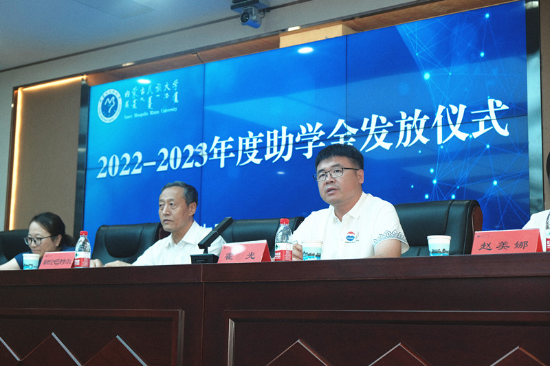 6月15日下午,内蒙古民族大学教育基金会在霍林河校区励志楼111会议室举行2022-2023年度助学金发放仪式。通辽市协成商贸有限责任公司总经理霍光、贵州茅台通辽专卖店店长赵美娜,教育基金会理事长朝伦巴特尔、秘书长高红梅出席仪式。相关学院领导,学工办、团总支及基金会老师,公司骨干及受资助学生参加仪式。仪式由校友工作办公室(基金工作办公室)主任白金英主持。