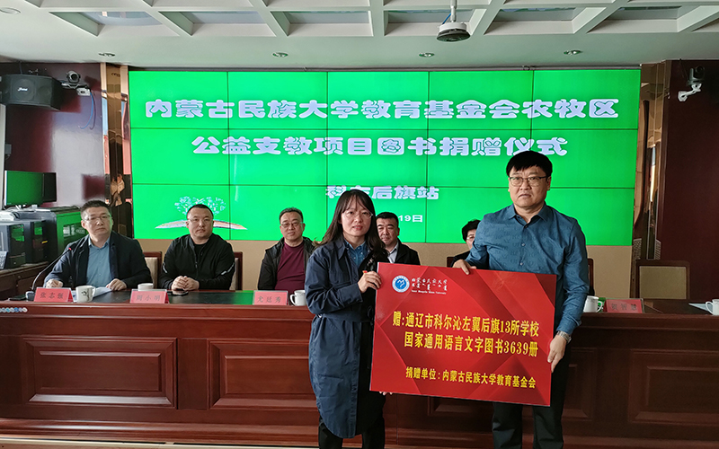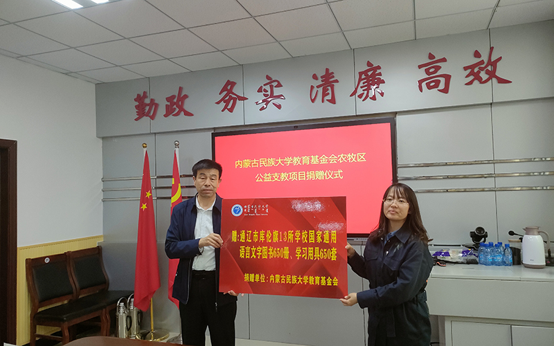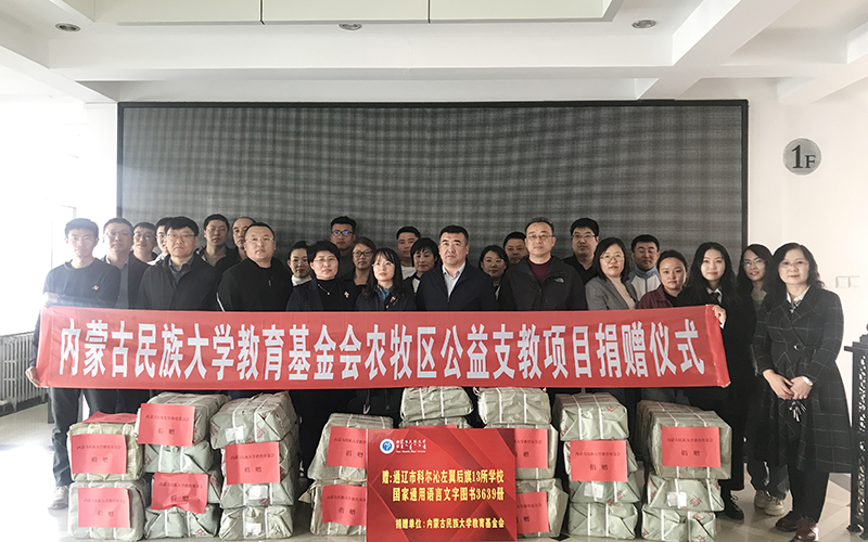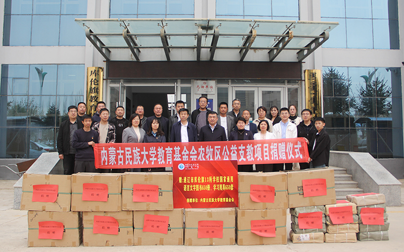 4月19日,内蒙古民族大学教育基金会赴通辽市科尔沁左翼后旗、库伦旗教体局举行农牧区公益支教项目捐赠仪式。通辽市教育局副局长布仁桑,内蒙古民族大学党政办公室副主任、教育基金会常务副秘书长贺智慧,学校教务处副处长李彩花以及教育基金会、党政办公室、教务处等相关工作人员参加仪式。