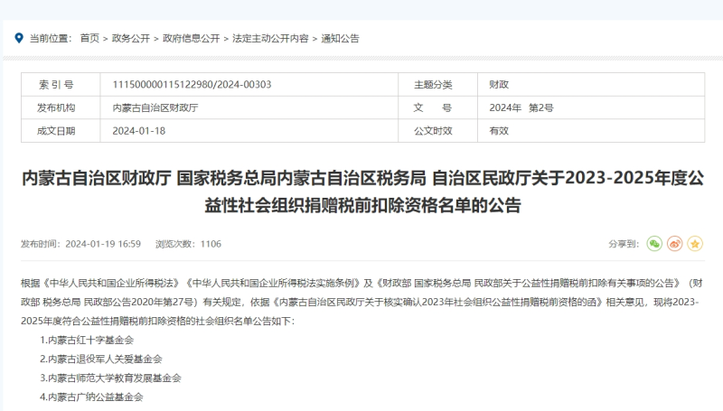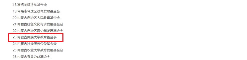 1月18日,内蒙古自治区财政厅、国家税务总局内蒙古自治区税务局、内蒙古自治区民政厅联合发布《关于2023-2025年度公益性社会组织捐赠税前扣除资格名单的公告》,内蒙古民族大学教育基金会(序号23号)获得2023-2025年度公益性捐赠税前扣除资格。获此资格,意味着向我校教育基金会捐赠的企业和个人可依法享受国家所得税税前扣除的税收优惠政策。