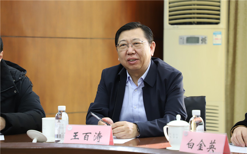 王百涛对西南政法大学的热情接待表示感谢,并简要介绍了学校基本情况,对西南政法大学教育基金会作为5A级社会组织取得的成绩表示钦佩,希望未来两校能够加强交流与合作,凝聚合力、共同发展。